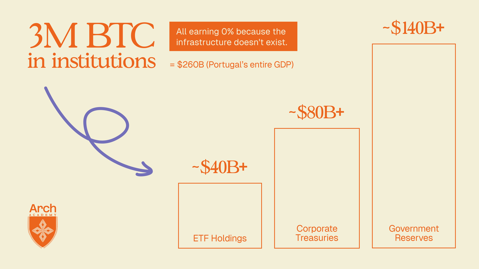 That's 3 million BTC spread across exchange-traded funds, corporate treasuries, and government reserves. More capital than Portugal's GDP sitting static, producing zero return. Not because institutions lack interest in yield, but because they lack the infrastructure to deploy capital safely while maintaining the custody model and settlement assurances they require.