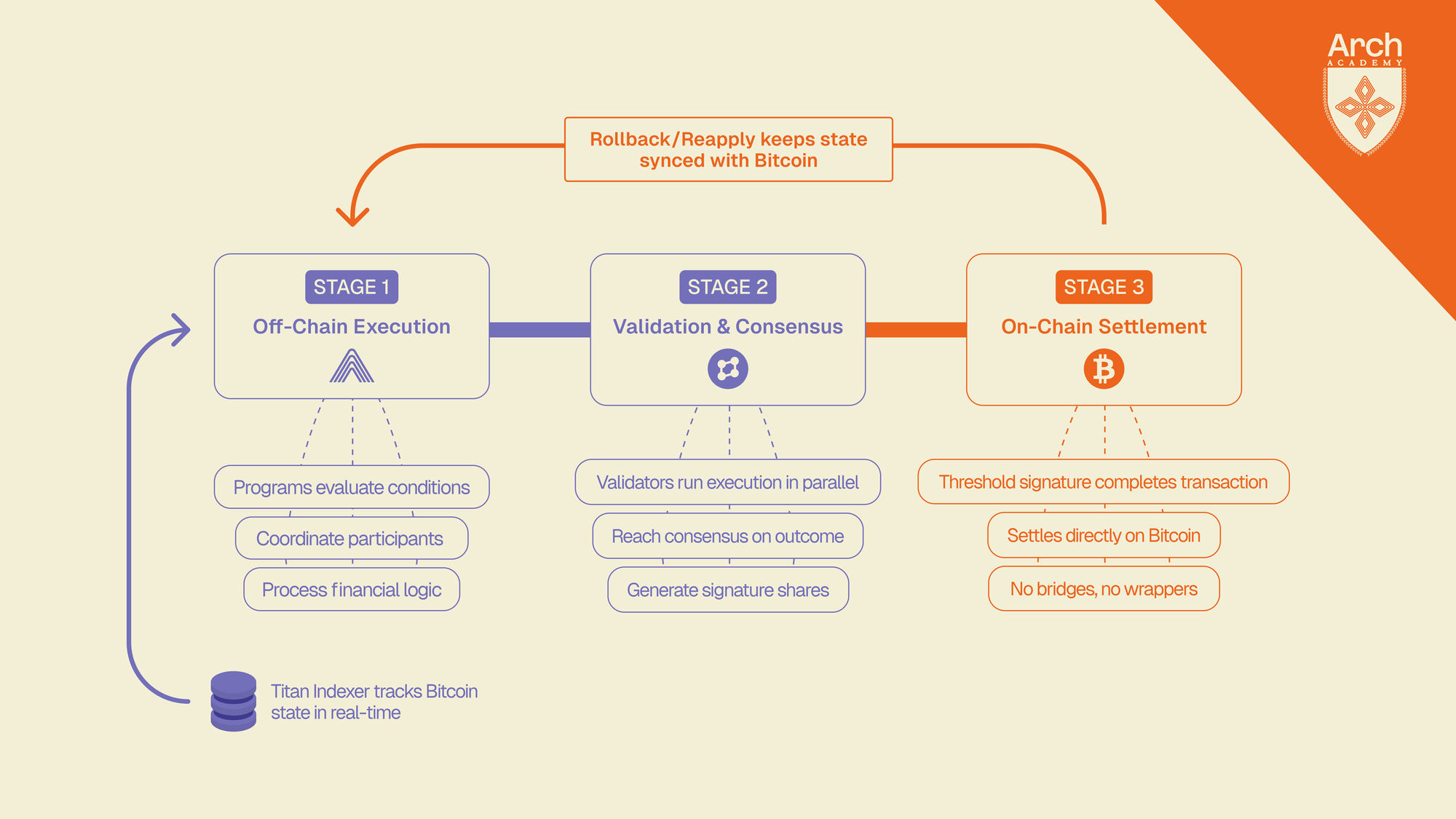 For all categories, alignment with Bitcoin is essential. Arch uses the Titan indexer and directed acyclic graph of state transitions to track Bitcoin activity in real time. Rollback and reapply methods keep program state consistent with the base layer when transactions change. This ensures collateral updates, credit events, structured payouts determine only after the execution environment reflects Bitcoin's actual state.